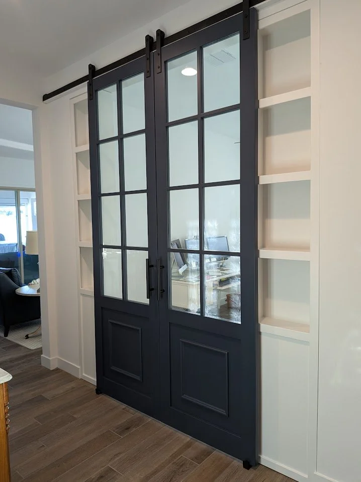 Available in single or double door sets. A custom built in to close off half the opening, while the traditional slider opens over top of.